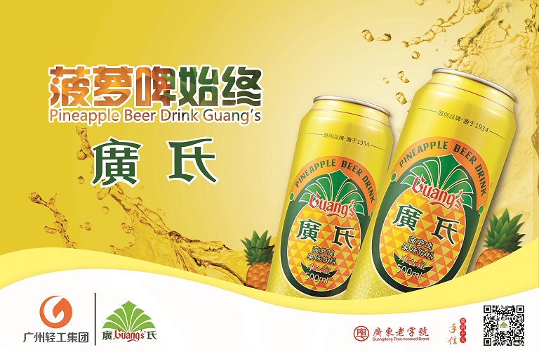 Guang’s Pineapple BeerGuang’s Pineapple Beer is a domestic pioneering brand, a drink with the flavor of pineapple based on beer and a with rich Lingnan characteristics. Made from raw materials such as malt, rice, sugar and hop, it boasts a perfect combination with the scent given off by ripe pineapple, a popular fruit in Lingnan. The beer is very popular among the consumers of South China for its strong fruit flavor, moderate sour and sweet taste, rich nutrition and a refreshing flavor.