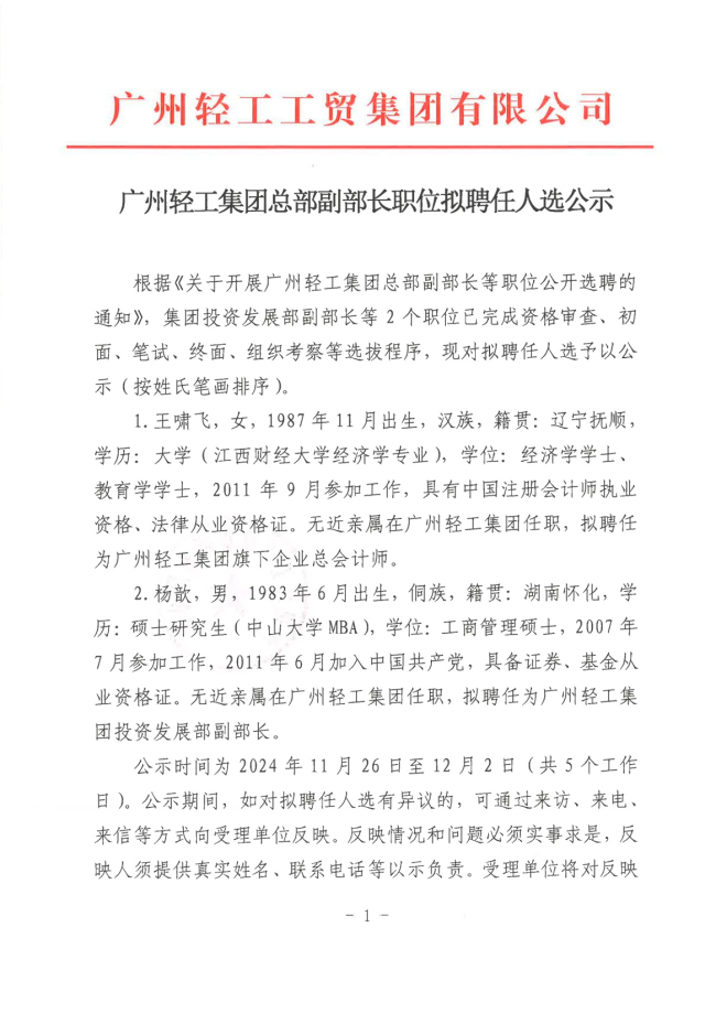 半岛平台轻工半岛平台总部副部长职位拟聘任人选公示